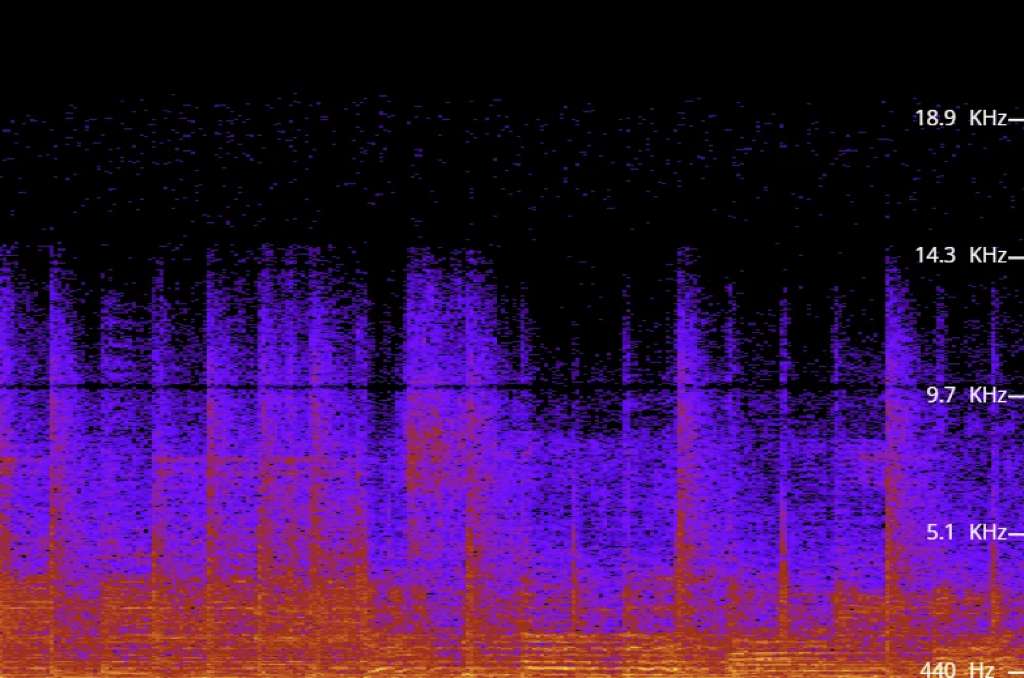 NDR provided the playlists for the shows Darius listened to, but the song wasn't there. Maybe it wasn’t actually aired on NDR? This possibility was proven false by the frequency analysis of Darius's tapes. NDR's broadcasts had a distinctive dip around 10,000 hertz, present in no other recordings. That was probably an artifact of their audio processing or their transmission chain. Think of it this way: at 10 kHz, the sound is quieter, and you can see that in every recording. And since audio tapes wobble, there were attempts to figure out the broadcasting date by looking at the offset of the 10k line.