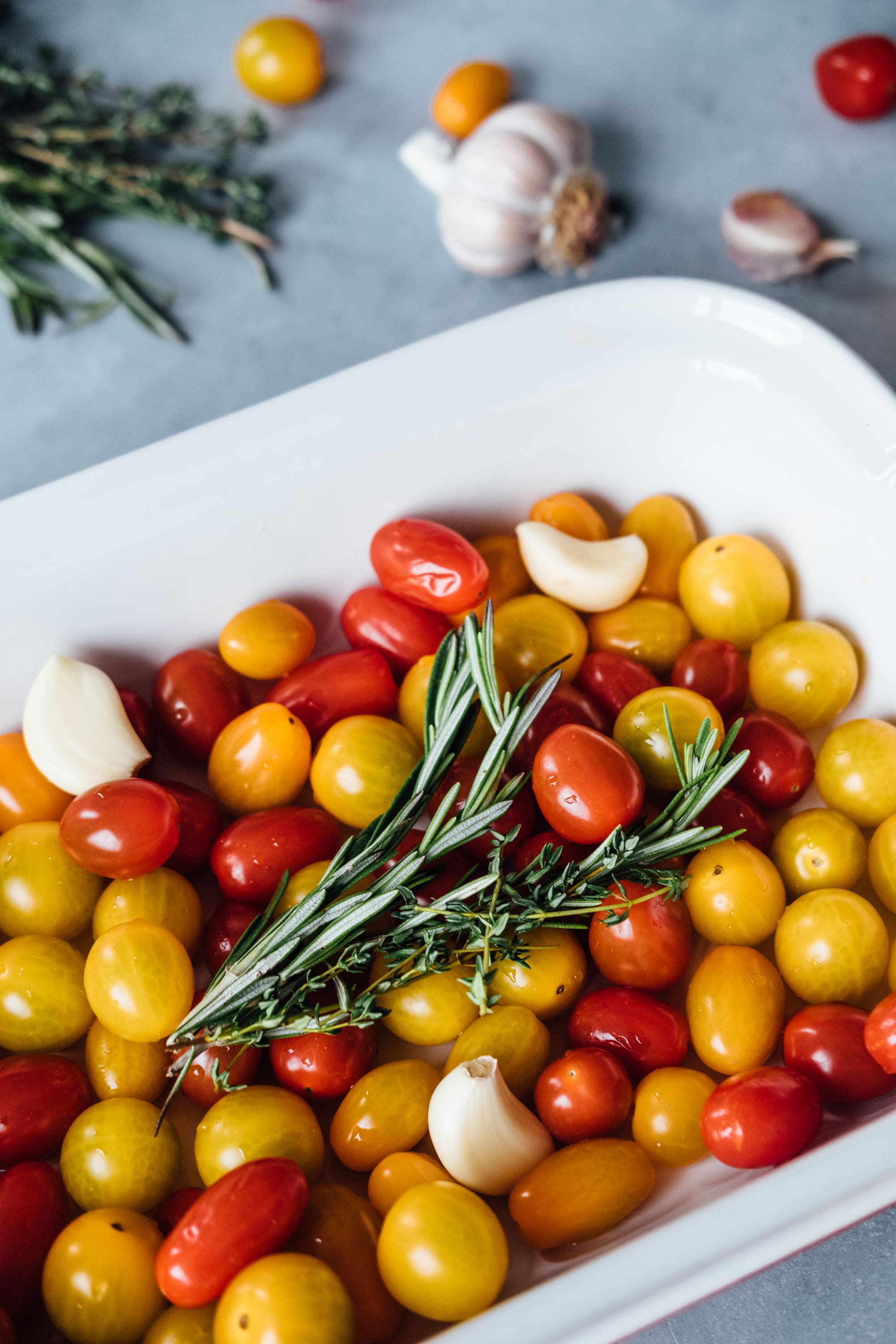 Wash the cherry tomatoes and put them, without cutting, in a baking dish. Add garlic cloves, rosemary, and thyme.