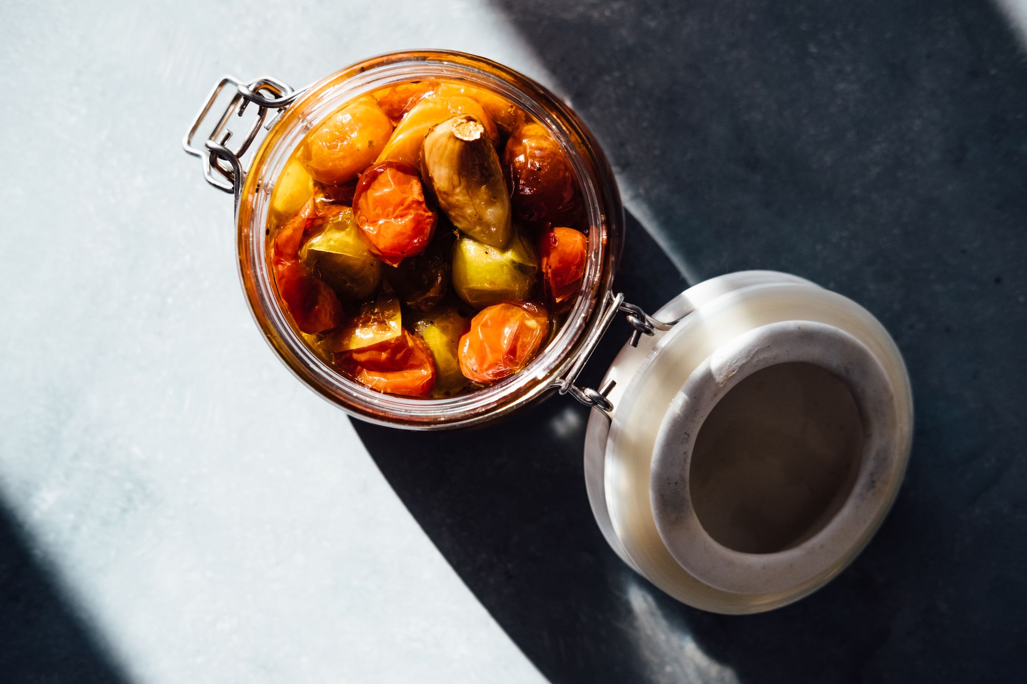 Let the confit cool and transfer to jars, and pour the olive oil from your baking dish over it. Olive oil will carry a lot of flavors, and also act as a natural preservative, preventing your confit from oxidation.